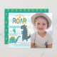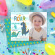 “Pise, mastigue e rugir”. Aqui está uma ótima maneira de celebrar o aniversário do seu filho com amigos e familiares. Envie este convite de aniversário fotográfico simples, divertido, festivo, moderno e personalizado dentro do orçamento. Uma visualização divertida, caprichosa e lúdica de um adorável brontossauro azul-turquesa kawaii, um t-rex azul-teal-marinho e uma tipografia manuscrita divertida sobre um fundo listrado azul-turquesa claro e branco no lado esquerdo, e a foto de sua escolha à direita, anuncia a festa de aniversário do seu filho. Um padrão de palmeira adorável sobreposto em azul-teal empoeirado está no verso. Este convite encantador certamente estabelecerá o tom certo para o seu evento! Pratos, guardanapos, adesivos, bilhetes de agradecimento e outros itens de aniversário correspondentes e coordenados também estão disponíveis nesta coleção especial e divertida. Basta adicionar a foto de sua escolha, digitar as informações da festa junto com o nome e a idade do seu filho, e você pode personalizar facilmente este convite de aniversário fot