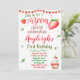 Convite de aniversário de morango, festa doce de Berry. O convite é para o primeiro aniversário (primeiro aniversario) do seu docinho. Convide seus amigos para uma celebração de doce de fruta com este convite de morango vermelho e verde.