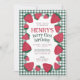 Este convite de aniversário de morango é perfeito para o primeiro aniversario de morango de um menino doce! Tem muitas bagas e um padrão de xadrez verde para uma fazenda ou piquenique estilada. É uma opção excelente para a festa de aniversário de um menino ou de uma menina! © 2023 Tea Olive Co.