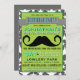 Convite de aniversário de Mustache Bash Chevron. Sua festa será toda a raiva quando todos trazerem o bigode para a festa de aniversário. Este convite para festas de aniversário de crianças apresenta um fundo de cinza neutro com estrelas em abundância e cobertura verde de chevron que mantém todo o texto do seu partido. Um banner de cinza em direção ao topo lia "Festa de aniversário", para o caso de alguém se perguntar. O texto serif azul, preto e branco é apresentado em um layout de estilo poster muito moderno e de quadril e um bigode enorme é também um destaque neste convite. Um convite de hipster para qualquer parte de aniversário, seja você adulto ou criança!