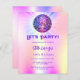 Um convite de festas feminino do 18º (ou qualquer idade). Um fundo holográfico colorido em roxo, rosa, amarelo, azul. Decorado com uma bola colorida de discoteca. Texto: Partido do Vamos! Personalize e adicione um nome e detalhes da parte. O nome é escrito com um script de estilo manuscrito, letras cor roxa. 1 folha = 1 convite impresso de borda a borda.
