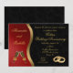 Um convite de festa de aniversário de casamento de 50 anos preto, vermelho e dourado. Taças de champanhe tilintando e alianças de casamento unidas, adornam este cartão de festa.