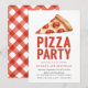 Convites de festas de aniversários com temas de pizza legal e divertida apresentando uma fatia de cor d'água de pizza de pepperoni com "pizza party" em negrito tipografia vermelha. Personalize as convites de festas de pizza adicionando o nome, a idade e os detalhes da festa do aniversariante ou da garota. O lado inverso do convite apresenta um padrão de gingham vermelho de aquarela.