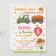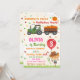 O convite de aniversário de trombete de aboborinha Aniversário Bicho de outono para a rapariga. Convide seus amigos com este brilhante e colorido convite para o tema do Festival de outono de outono! Este convite vermelho, laranja, cor-de-rosa e verde do outono apresenta um pequeno espantalho bonito segurando um balão vermelho, trator verde com abóboras e algumas folhas ao redor. Simplesmente edite este menu de personalização fácil de usar modelo para torná-lo especial.