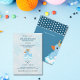 Aqui está um convite de festa de aniversário adorável com um pato de borracha azul vestindo uma coroa e sentando em bolhas. Atualize facilmente o texto do espaço reservado com o modelo fácil de usar. O dorso está em azul e branco coordenadores com bolinhas e o pato azul com a palavra "um convite especial".