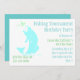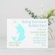 convite de aniversário de pesca de Na moda, feito em branco, com placas gráficas silhuetas de um grande baixo de cor aqua saltando da água, depois de um inseto verde. Texto em aqua e verde está pronto para personalizar para seu dia especial. ideia de Excelente para o ávido pescador.