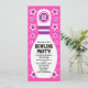 convite de festas de boliches divertida e colorida para crianças com um pino de boliche branco com idade de aniversário personalizável e convidam texto cercado por estrelas brancas e roxas sobre um fundo rosa quente. Para solicitações personalizadas, use o link de contato de armazenamento acima.