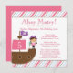 Este convite de festa de aniversario de meninas quadrado 5.25x5.25 tem um tema pirata rosa e roxo! Há uma pirata marrom de cabelo navegando em seu navio pirata ao lado de um papagaio do lado esquerdo. Nas bordas superior e inferior, há um padrão de listras fino, branco, esticado e aqua. À direita, você pode personalizar facilmente as informações de sua parte. Alguns elementos design de STOCKBERRY STUDIO