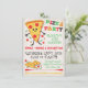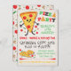 Festa de aniversário de Pizza Feliz e Colorido com fatias deliciosas de pizza e tipografia divertida em um fundo de linho Faux. Excelente para uma garota ou um garoto! Ilustração desenhada à mão por McBooboo.