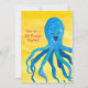 Um convite divertido para reunir as crianças para uma festa de aniversário decorada com um polvo azul feliz ilustrado com vários tons de aquarela em um fundo amarelo brilhante de lavagem com aquarela.