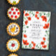 Convite de aniversário Floral em vermelho, branco e verde com um quadro de papoilas e folhas verdes. A parte traseira apresenta um disquete de solteiro.