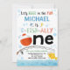 Convite de aniversário o-fish-ialmente um, perfeito para uma celebração com tema de pesca. Apresenta tipografia em negrito, bolhas, peixes dourados, bóia vermelha, anzóis e elementos de água.