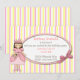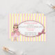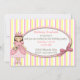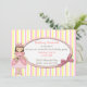 Convite de aniversário de princesa para menina, feito em um fundo listrado branco, rosa e amarelo. Uma área de texto oval fica por cima, com gráficos de um laço rosa, no lado direito e gráficos rústicos de uma menina Princesa, no lado esquerdo. Personalize o texto para a festa de aniversário do seu filho. Sua filha se sentirá uma verdadeira Princesa, com esses convites doces para a festa dela. Produtos combinando disponíveis.