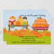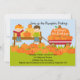 Comece a tirar a festa de aniversário do rapaz de abóbora com as nossas crianças, abóbora, a escolher o convite de aniversário, com uma rapariga e um rapaz sentados numa pilha de feno com um vagão vermelho cheio de abóboras e um campo de bombeamento.