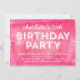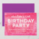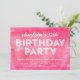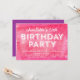 Convite de festa de aniversário moderno com as palavras "Festa de Aniversário" em branco contra um fundo de padrão de tinta enrolada rosa que é perfeito para qualquer idade. O convite de aniversário inclui um verso roxo. Confira outros convites de aniversário aqui https://www.zazzle.com/collections/childrens_birthday_invitation-119229052564655496?rf=238364477188679314 e aqui https://www.zazzle.com/collections/birthday_invitations_for_adults-119400127857134028?rf=238364477188679314