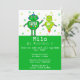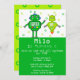 Um convite de aniversário divertido e colorido com um tema de robô. A design apresenta dois robôs bonitos e amigáveis em coordenação de tons de verde. Um robô ondulante e seu companheiro voador estão cercados por um confete em forma de engrenagem. O texto pode ser totalmente personalizado com os detalhes do seu próximo evento. A parte de trás do convite apresenta um padrão vibrante de engrenagens. As crianças ficarão felizes em entregar estes convites aos seus amigos.