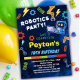 Personalize seus próprios convites de festas de aniversários robóticos para meninos e meninas.