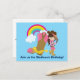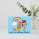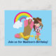 Cartão de convite de aniversário de caubói fofo com uma menina vestida de rosa encostada em uma bota de cowboy e inclinando o chapéu. O arco-íris contra o fundo de céu azul torna um toque bonito para este convite de festa de rodeio personalizado legal.