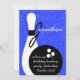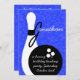 O fundo azul escuro da aguarela com um pino de boliche e uma bola preta grande é tudo que você precisa de convidar todos seus amigos para um jogo. O texto escrito na bola de boliche é agradável e na parte de trás de todo o fundo azul, o texto branco está para fora perfeitamente. Todo o texto no convite pode ser personalizado.