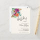 Cartão postal de convite de aniversário com um arranjo de flores contendo lindas rosas rosa, laranja e branca cercadas por folhas verdes.