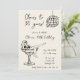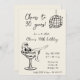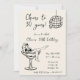 Convite de aniversário desenhado e manuscrito com uma bola de disco e uma mulher sentada em um coquetel.