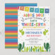 Traga a festa para o grande dia do seu pequeno com este divertido convite de aniversário Three-esta! Perfeito para uma festa de 3º aniversário cheia de tacos, música e cor. Este modelo editável apresenta um design inspirado no México, cores vibrantes e ilustrações festivas que definem o tom para uma celebração alegre.