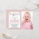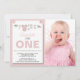Um convite de foto de primeiro aniversário lindo e moderno que você pode personalizar e enviar para amigos e familiares para a celebração da festa de aniversário. O texto é definido em uma tipografia popular. Substitua a foto de exemplo pela sua. As cores do texto rosa, verde e preto podem ser alteradas usando o menu de edição. O padrão de listras rosa e branco adorna a parte de trás do cartão. Outras cores e padrões estão disponíveis.
