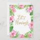 vamos verde e rosa coloridos e brilhante convite de aniversário. Este design apresenta uma folhagem verde, cor-de-rosa, um flamingo e flor de hibisco. Excelente para um vamos de festa de aniversário de menina com problemas.