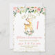 Convite de aniversário de veados da moça apresentando um arranjo floral de aquarela no topo do design em branco e verde e um veado de aquarela fofo. O design também apresenta um cabeçalho de folha de ouro falso arquivado e um número rosa editável. Excelente para o primeiro aniversário, mas pode ser utilizado para uma idade diferente.