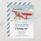 Todo o texto é editável no convite. Perfeito para um tema de vintagem de avião. Possui avião vermelho clássico, nuvens desenhadas à mão e céu azul.