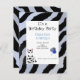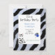 Um belo convite de aniversário da selva com um pequeno desenho animado. Uma borda de padrão de zebra em azul e preto. Personalize com todas as informações de sua parte conforme desejado.