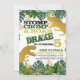 Dinossauro Dourado e folhas tropicais verdes e douradas convidadas com texto aflita para o convite de aniversário do seu filho.