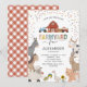 Convites de aniversário infantis da fazenda fofos com um fundo branco simples, animais da fazenda adoráveis, incluindo uma vaca, cabra, porco, ovelha, burro, cavalo, coelho, pato e um galo, e um modelo de celebração de aniversário infantil fácil de personalizar.