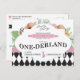 Ouçam, ouçam! Convide toda a sua família e amigos para a festa de primeiro aniversário com tema Alice no País das Maravilhas com estes divertidos convites de postais de aniversário. Apresenta designs florais e padrões nas cores rosa, verde menta e preto.