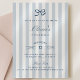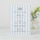 Convite para o aniversário de um bebê elegante que inclui listras verticais claras e azuis de bebê, fontes sans-serif modernas e uma fonte delicada para o nome da criança. Acentuado com um arco encantador, este design é perfeito para um quinto aniversário com um tema de festa inspirado em eterno, pré-disquete ou Hamptons.