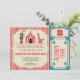 O convite de aniversário do circo desta menina caracteriza um selo e um urso de execução, um bilhete, uma tenda do circus, um quadro decorativo e algumas palavras tiradas. O fundo é em parte um teste padrão vermelho listrado e em parte azul. Eu quis criar um sério novo de convites do aniversário do circo porque foram amados muito no passado e são divertimento a projetar. Este convite do circo pode ser usado para várias idades enquanto o número da idade pode ser alterado. Poderia igualmente ser usado para um rapaz pequeno. Este convite de aniversário do circo está pronto para ser personalizado.