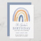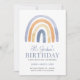 Um convite de aniversário de um doce estilo aquarela, com cor azul, do arco-íris, com tipo colorido. Simples e caprichoso. Padrão do arco-íris no verso do convite.