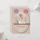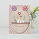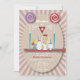 Um convite de aniversário que caracteriza uma ilustração de um bufete dos doces. A ilustração inclui pirulitos com bunting in-between, gumballs, doces da vara, e doces de rocha. Fundo oval e do sunburst. Personalize o texto.