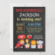 Convite de Aniversário do Carnaval do Circo. Convite de Primeiro Aniversário para Menino. Festa temática de Circo. Fundo de Quadro Negro. Para personalização adicional, clique no botão "Personalize" e use nossa ferramenta de design para modificar este modelo.