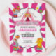 Convite de aniversário para o Carnaval, cor-de-rosa e branca, com detalhes coloridos do que você vê em um carnaval.