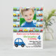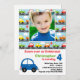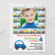 Personalize o convite de aniversário desta criança do carro. É tão fácil fazer, apenas muda os detalhes do partido, adiciona uma foto de sua criança e você é feito! Carros e caminhões coloridos das características multi que conduzem abaixo da rua. Alguns elementos Goodness&Fun