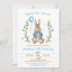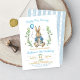 O convite de aniversário de um menino páscoa apresenta Peter Rabbit fofo com eucalipto verde segurando um balão. Esta design é ideal para alguém que tenha uma festa de aniversário temática Peter Rabbit.