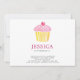 Um convite de aniversário moderno para o aniversário de uma menina apresentando um cupcake de aquarela em rosa e amarelo, e texto de convite na fonte da cinza escura. O suporte do cartão está na fúcsia. Outras peças neste design estão disponíveis.