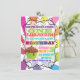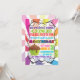 Convite de aniversário super colorido ao estilo poster do arco-íris, ao estilo do sunburst, com um cupcake brilhante e uma tipografia alegre e alegre. Excelente para menino ou menina! Ilustração desenhada à mão por McBooboo.
