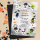 Prepare-se para um tempo espetacular com este convite de aniversário de Halloween fofo! Apresentando crânios brincalhões em figurinos coloridos, doces, morcegos e teias de aranha em um fundo de cinza fantasma, é a maneira perfeita de convidar convidados para a sua pequena e divertida cesta de fantasia. Personalize com o nome, a idade e os detalhes da festa do seu filho para criar um convite assustadoramente encantador.