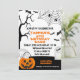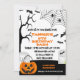 Convite de Aniversário do Dia Negro Laranja Procurando um convite de aniversário para crianças do Dia das Bruxas, preto e branco? Esta design certamente define a cena de uma espetacular festa de aniversário de outono ou outono no outono. Apresenta algumas cabeças de túmulo, abóbora, morcegos, aranhas, teias de aranha e árvore assustadora.