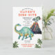 Um convite de aniversário de dinossauro dino-ácaro que apresenta um brontossauro, folhas de palma primevais e um vulcão em erupção. Uma cena desde o início do tempo, com tipografia colorida em verde vermelho e branco. Negrito e amigável. Este dino amigável não é muito assustador para crianças pequenas!