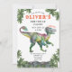 Um convite de aniversário de dinossauro fofo com dinossauro, primeva e palmeiras.