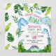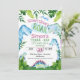 Convite de aniversário do três rex azul e verde para um menino, apresentando vários dinossauros, folhagens e um ovo. Este design de convite de dinossauro é uma maneira fofa de preparar o cenário para uma festa de aniversário com tema de dinossauro.