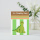 Um dinossauro fofo com um corpo verde, manchas verdes escuras e uma cauda espichave. Um fundo de listras verdes e brancas atrás dele. Uma borda marrom com faixas divertidas em verdes e cores laranja o acendem. Personalize com todas as informações de sua parte conforme desejado.